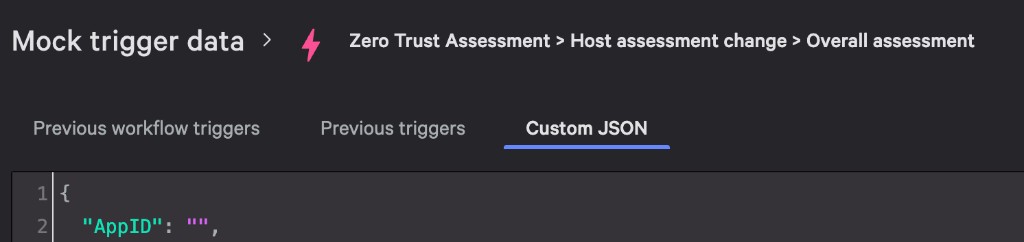 To verify the workflow end-to-end (and to complete Create the ZTA workflow step 10), use Custom trigger data in CrowdStrike Fusion to use CrowdStrike's provided Custom JSON: