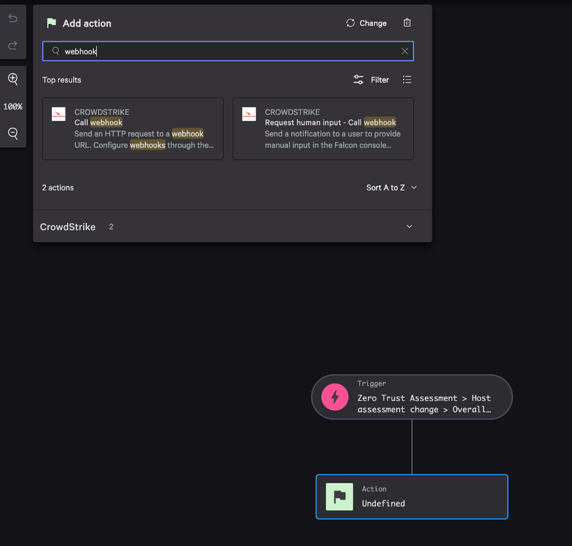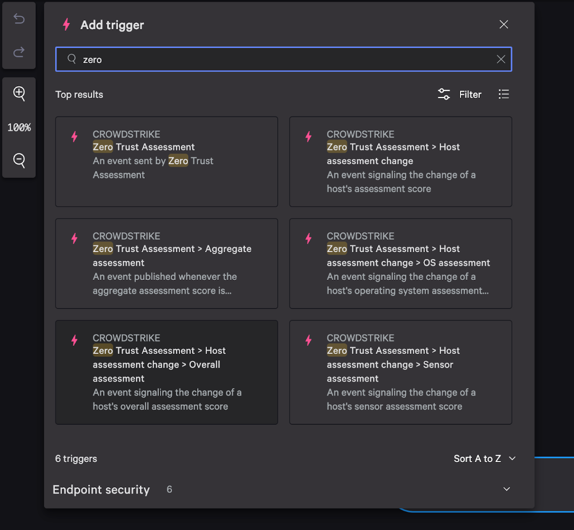 After you configure CrowdStrike, validate the ZTA workflow end-to-end using CrowdStrike-provided mock trigger data. This confirms not just that Control Center can receive CrowdStrike events, but that the Fusion workflow and webhook are wired correctly.