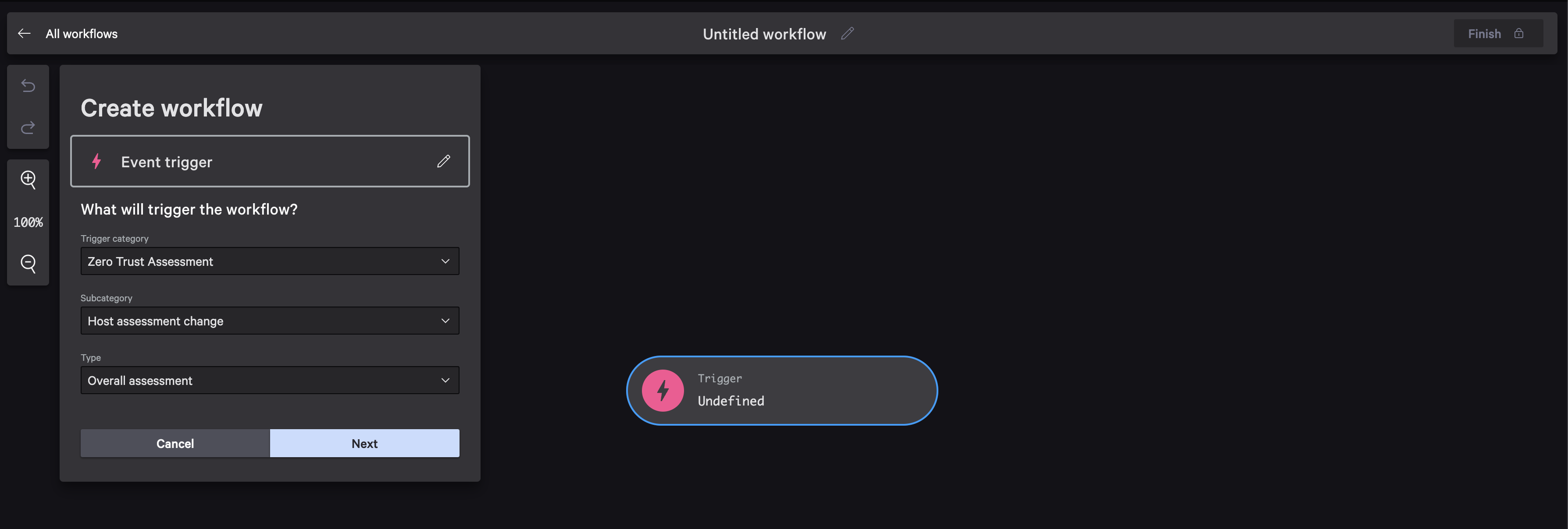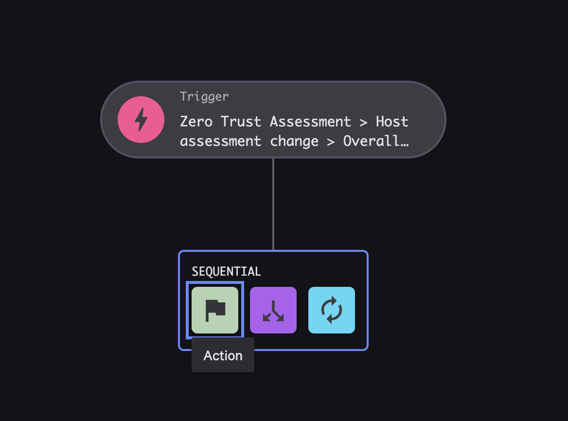 Configure the event trigger for ZTA changes (for example: Zero Trust Assessment → Host assessment change → Overall assessment), then select