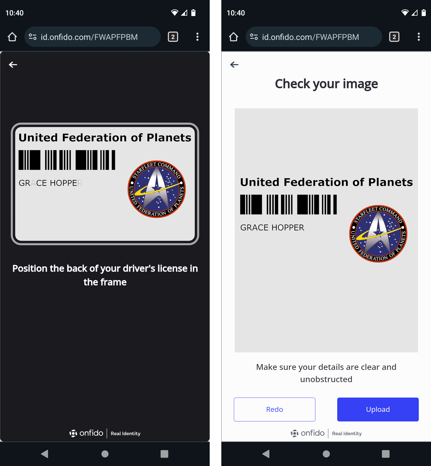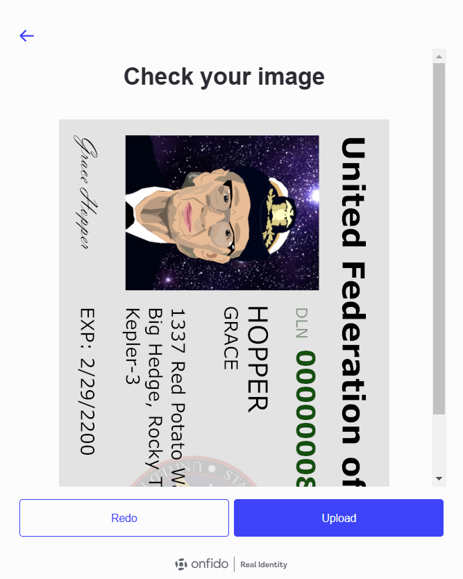 If you are asked to upload the back of the document, repeat the process to capture a picture of the back. You will have a chance to review it; Redo it if you need to, or click Upload if you're satisfied.