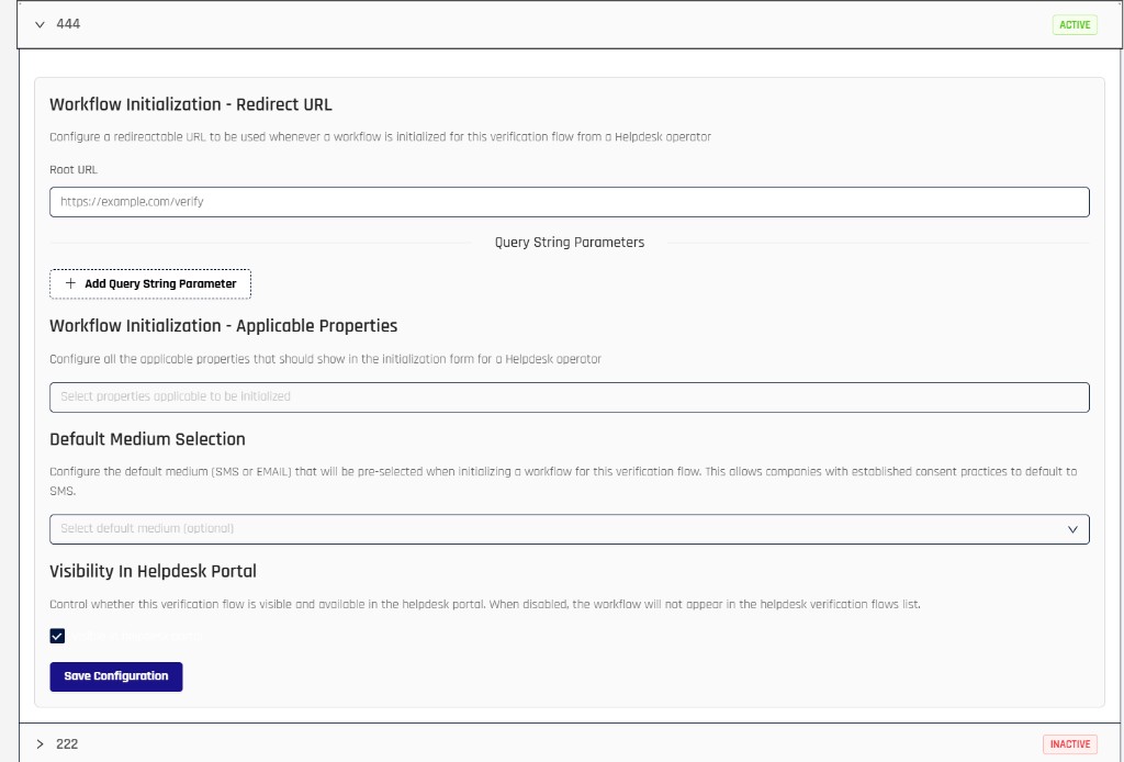 Below the universal settings, the page lists all verification flows. Each flow can be expanded so that administrators can configure Helpdesk behavior for that specific workflow.