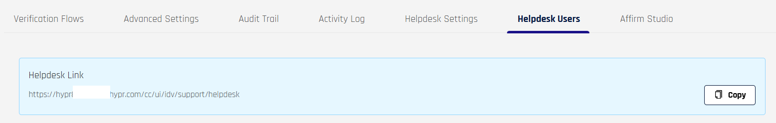 In HYPR 11.1 and later, the Helpdesk Settings and Helpdesk Users tabs in the HYPR Affirm menu in Control Center display a blue Helpdesk Link banner with a URL and a Copy control. Administrators and analysts can copy this link and share it with helpdesk agents.