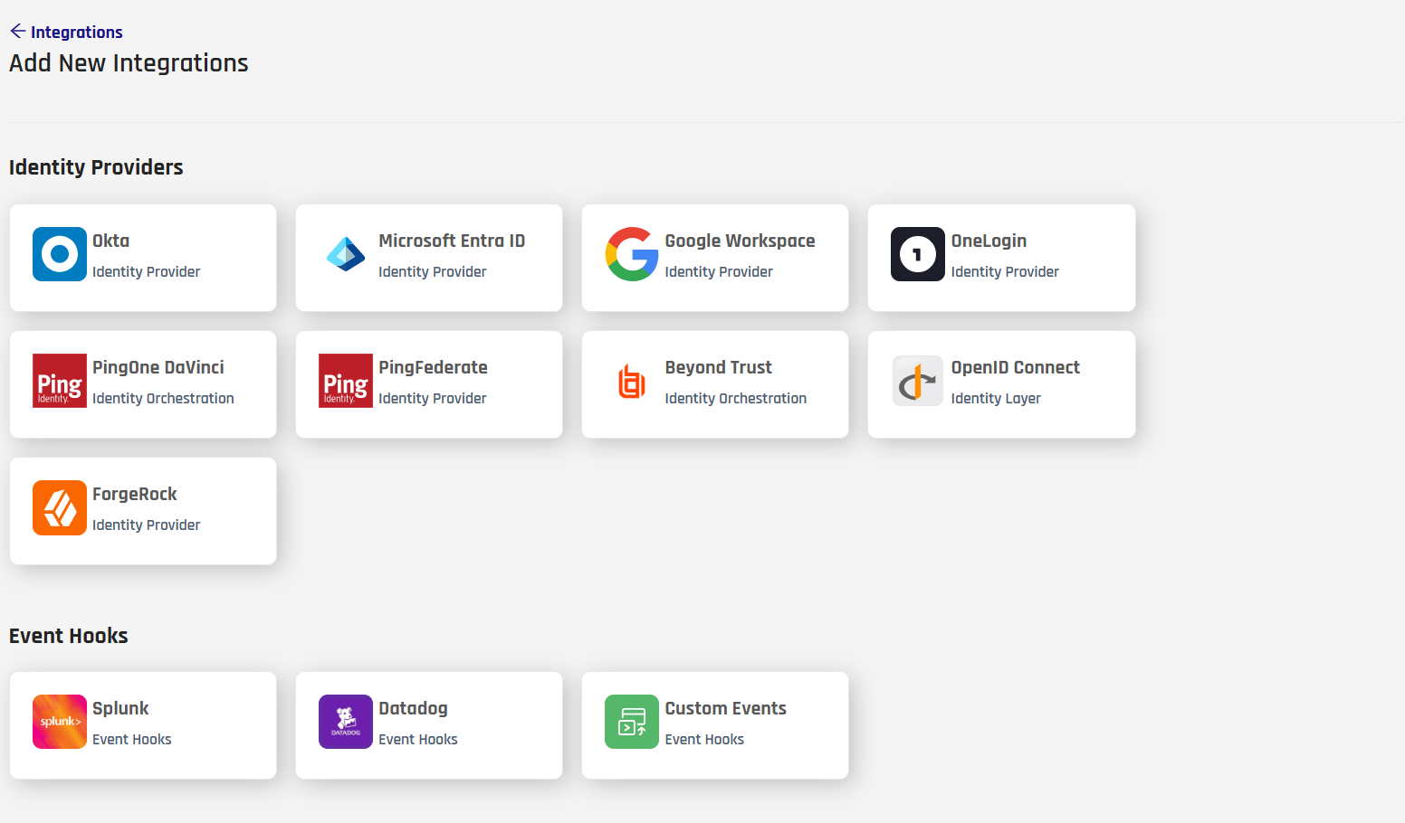 Go to the Integrations screen in the HYPR Control Center and click Add New Integration to show a list of available integration types.