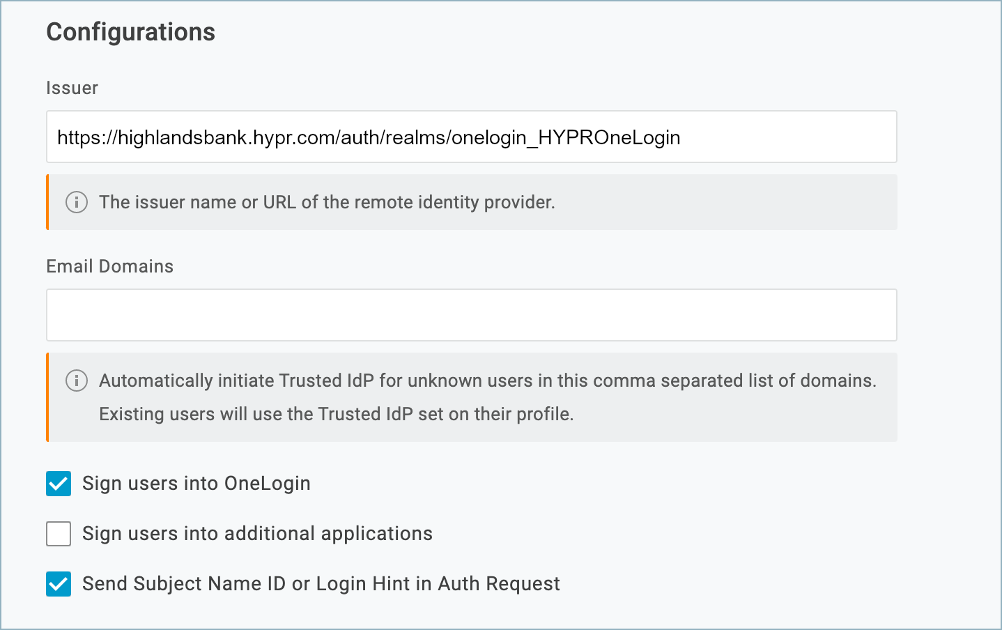 https://highlandsbank.hypr.com/auth/realms/onelogin_HYPROneLoginSign users into OneLogin Checked Sign users into additional applications Unchecked Send Subject Name ID or Login Hint in Auth Request Checked -
