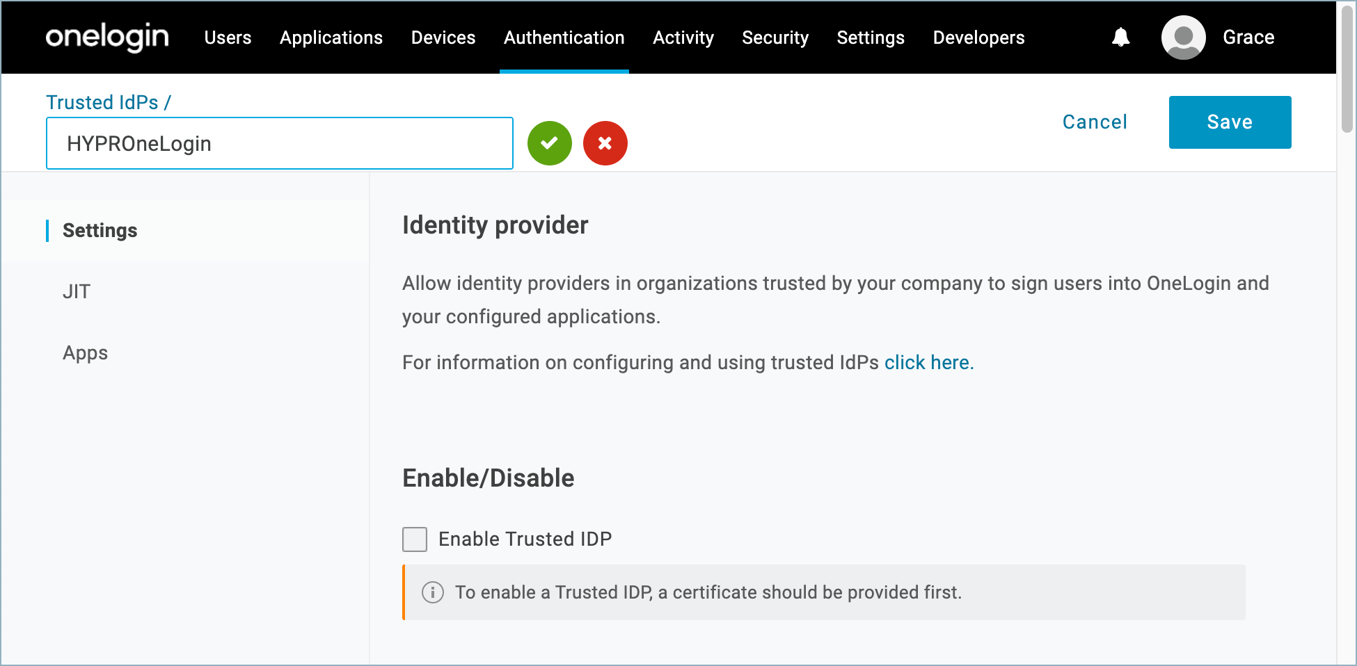 In the Enable/Disable section, turn on Enable Trusted IDP.