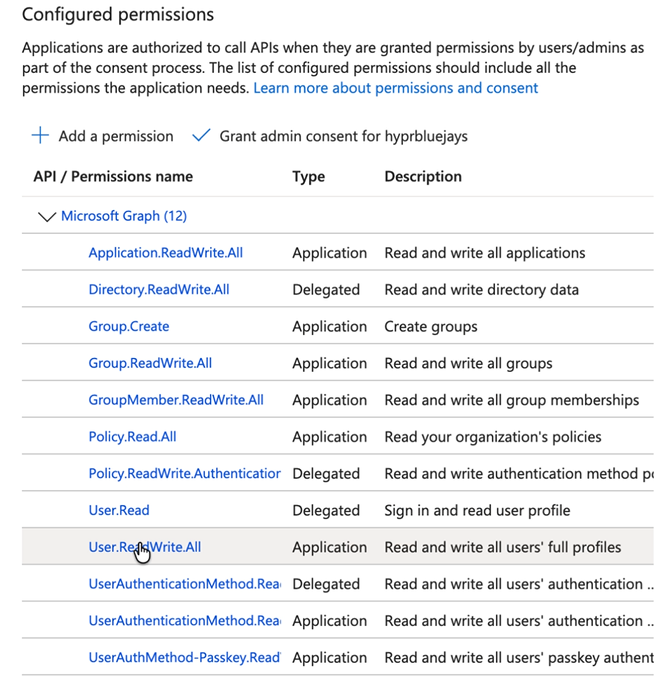 Make sure to save the Application (client) ID, Directory (tenant) ID, and Client secret as you'll need these for the HYPR Control Center™ configuration. The client secret and the API permissions should enable you to create your HYPR integration.